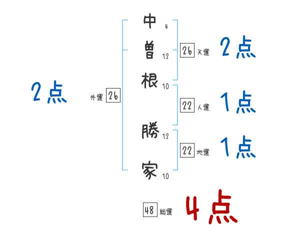天運![]() | 中曽根勝家さんの天運は26画の2つ星!波瀾万丈かも。信頼できる人を大事にしましょう。 家系が持つ宿命的な運勢を表します。祖先から受け継いだ苗字ですので自分の力が及びません。家柄を象徴します。 |