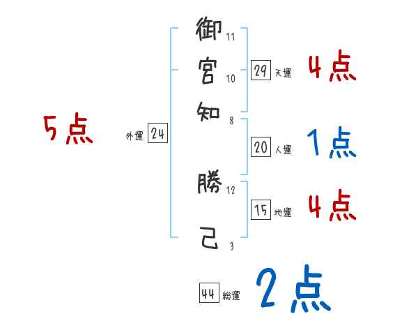 総運![]() | 御宮知勝己さんの総運は44画の2つ星!誠実で慎重な性格。物事を考えすぎないように注意しましょう。 あなたの人生を表す1番重要な運勢です。生涯を通じて影響する総合運となり、主に50歳以降の晩年期に影響を及ぼします。 |