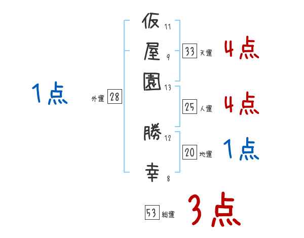 総運![]() | 仮屋園勝幸さんの総運は53画の3つ星!やや見栄っ張りで虚栄心がある。散財に注意。 あなたの人生を表す1番重要な運勢です。生涯を通じて影響する総合運となり、主に50歳以降の晩年期に影響を及ぼします。 |