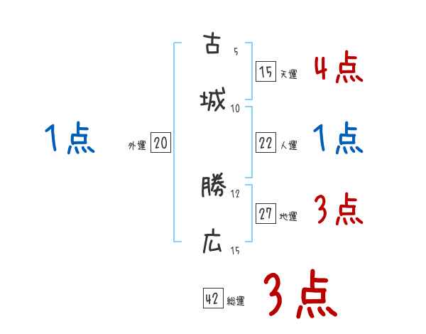 天運![]() | 古城勝広さんの天運は15画の4つ星!人徳があり出世する。順調に物事を進め円満な人生。 家系が持つ宿命的な運勢を表します。祖先から受け継いだ苗字ですので自分の力が及びません。家柄を象徴します。 |