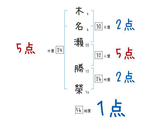 人運![]() | 木名瀬勝榮さんの人運は32画の5つ星!柔軟性があり成功する。チャンスが多く金運が良い。 性格や才能などを表す2番目に重要な運勢です。人間関係や協調性、社会的な成功に影響します。主に20歳から50歳ぐらいまでの中年期の運勢を表します。 |