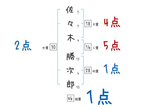人運![]() | 佐々木勝次郎さんの人運は16画の5つ星!人望が厚く大きく発展する。逆転成功が見える。 性格や才能などを表す2番目に重要な運勢です。人間関係や協調性、社会的な成功に影響します。主に20歳から50歳ぐらいまでの中年期の運勢を表します。 |