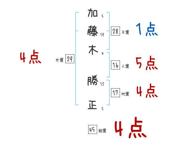 天運![]() | 加藤木勝正さんの天運は28画の1つ星!家庭環境に注意。スポーツで活躍できる能力があるかも。 家系が持つ宿命的な運勢を表します。祖先から受け継いだ苗字ですので自分の力が及びません。家柄を象徴します。 |