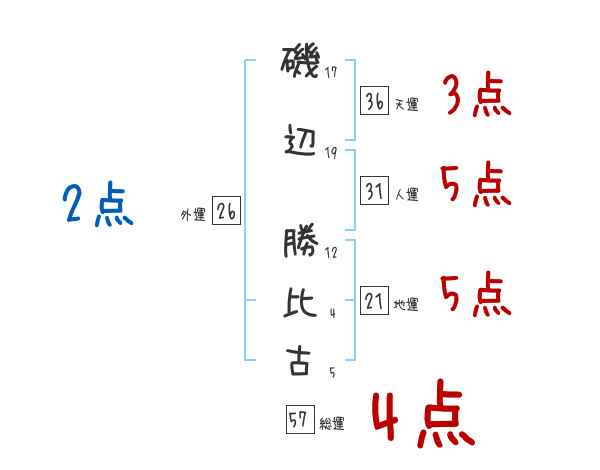 総運![]() | 磯辺勝比古さんの総運は57画の4つ星!向上心があり人望がある。地位を得る。 あなたの人生を表す1番重要な運勢です。生涯を通じて影響する総合運となり、主に50歳以降の晩年期に影響を及ぼします。 |