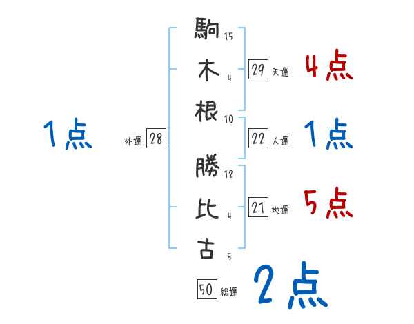 人運![]() | 駒木根勝比古さんの人運は22画の1つ星!努力することが苦手ないっぽう手先が器用。芸術性にも優れる。 性格や才能などを表す2番目に重要な運勢です。人間関係や協調性、社会的な成功に影響します。主に20歳から50歳ぐらいまでの中年期の運勢を表します。 |