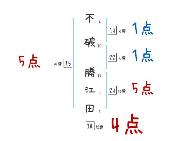 外運![]() | 不破勝江田さんの外運は16画の5つ星!人望が厚く大きく発展する。逆転成功が見える。 生活面を象徴する運勢です。外部から受ける影響力を表し、結婚運、家庭運や職場、環境への順応性を表します。 |