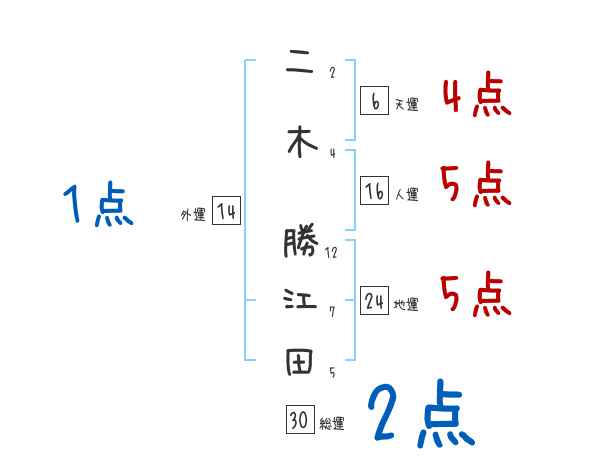 天運![]() | 二木勝江田さんの天運は6画の4つ星!慎重な努力家で信頼を得る。誠実な精神で向上心に優れる。 家系が持つ宿命的な運勢を表します。祖先から受け継いだ苗字ですので自分の力が及びません。家柄を象徴します。 |