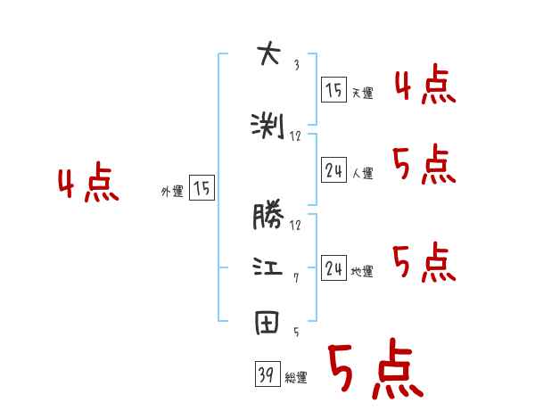 総運![]() | 大渕勝江田さんの総運は39画の5つ星!社交性に優れ人望が厚い。人の上に立ち成功する。 あなたの人生を表す1番重要な運勢です。生涯を通じて影響する総合運となり、主に50歳以降の晩年期に影響を及ぼします。 |