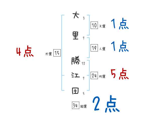 | 地運  | 大里勝江田さんの地運は24画の5つ星!家庭運が良く順調な人生。金運にも恵まれる。個性を表す基礎的な運勢です。性格形成や対人関係、行動力など家庭環境に影響されます。主に誕生してから20歳くらいまでの若年期の運勢を表します。 |