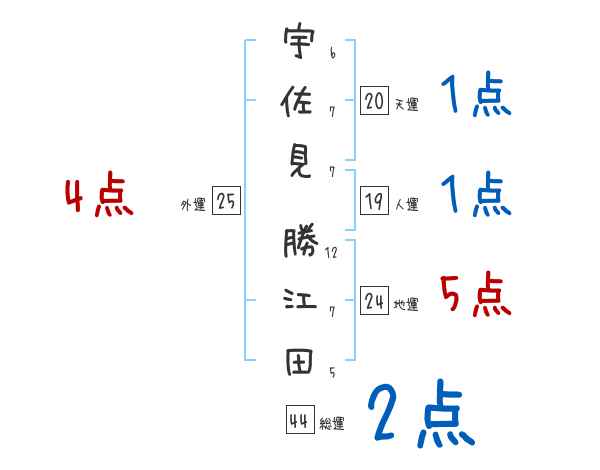 人運![]() | 宇佐見勝江田さんの人運は19画の1つ星!優れた才能を持ちますが、協調性が足りないことも。周りの人と協力する事を意識しましょう。 性格や才能などを表す2番目に重要な運勢です。人間関係や協調性、社会的な成功に影響します。主に20歳から50歳ぐらいまでの中年期の運勢を表します。 |