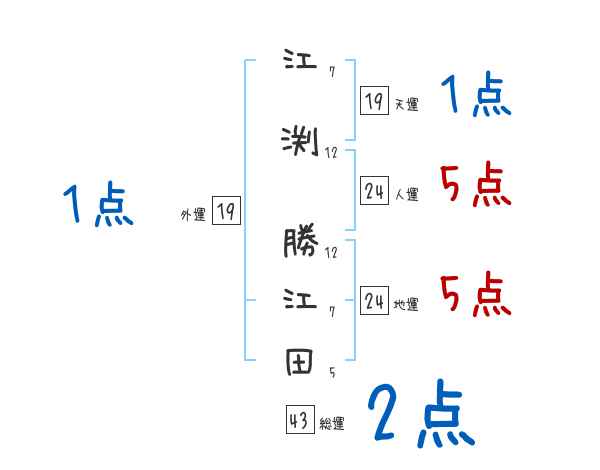 人運![]() | 江渕勝江田さんの人運は24画の5つ星!家庭運が良く順調な人生。金運にも恵まれる。 性格や才能などを表す2番目に重要な運勢です。人間関係や協調性、社会的な成功に影響します。主に20歳から50歳ぐらいまでの中年期の運勢を表します。 |