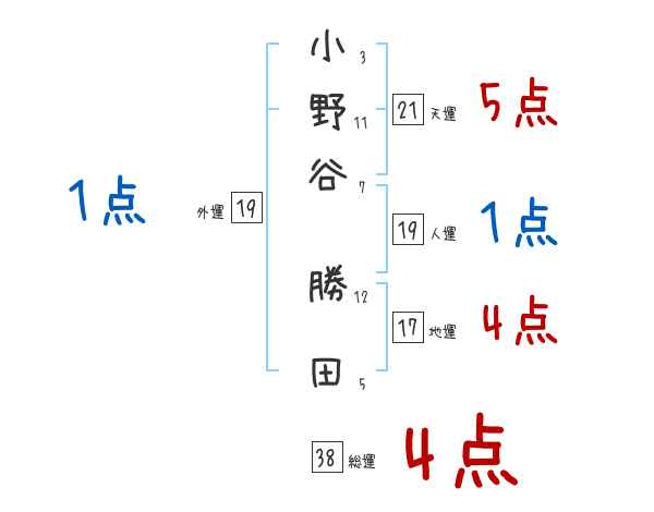 天運![]() | 小野谷勝田さんの天運は21画の5つ星!統率力がある。独立し成功する。名誉を手に入れる。 家系が持つ宿命的な運勢を表します。祖先から受け継いだ苗字ですので自分の力が及びません。家柄を象徴します。 |