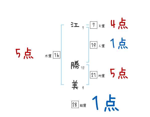 外運![]() | 江勝美さんの外運は16画の5つ星!人望が厚く大きく発展する。逆転成功が見える。 生活面を象徴する運勢です。外部から受ける影響力を表し、結婚運、家庭運や職場、環境への順応性を表します。 |