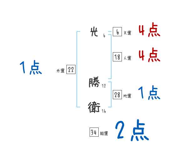 総運![]() | 光勝衛さんの総運は34画の2つ星!独創性に優れるが、自尊心が強く災難に注意しましょう。 あなたの人生を表す1番重要な運勢です。生涯を通じて影響する総合運となり、主に50歳以降の晩年期に影響を及ぼします。 |