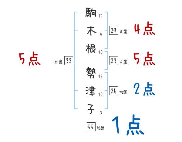 外運![]() | 駒木根勢津子さんの外運は32画の5つ星!柔軟性があり成功する。チャンスが多く金運が良い。 生活面を象徴する運勢です。外部から受ける影響力を表し、結婚運、家庭運や職場、環境への順応性を表します。 |