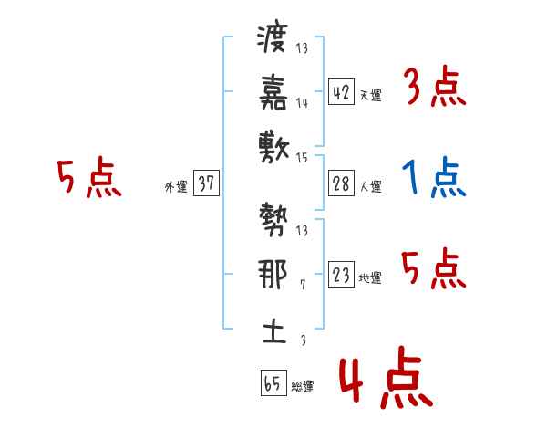 外運![]() | 渡嘉敷勢那土さんの外運は37画の5つ星!努力家で順応性に優れる。現実的な考え方ができ忠実に物事をこなす。 生活面を象徴する運勢です。外部から受ける影響力を表し、結婚運、家庭運や職場、環境への順応性を表します。 |