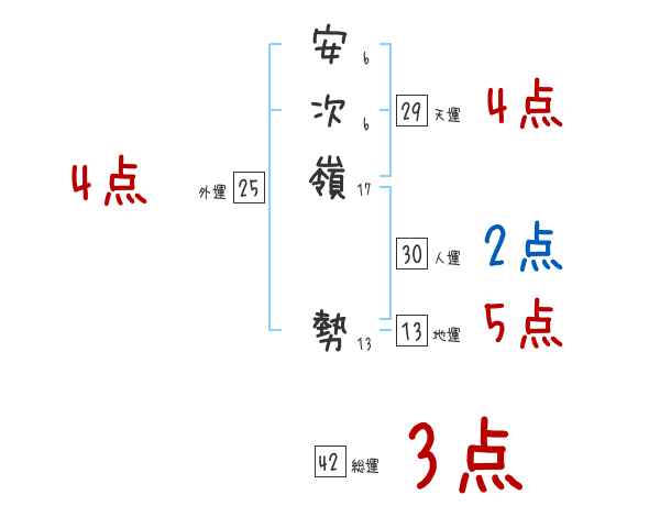 安次嶺勢さんの画数の鑑定結果