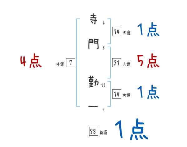 天運![]() | 寺門勤一さんの天運は14画の1つ星!人に対して優しいがストレスを溜め込みがち。人間関係のトラブルを避けるよう気をつけましょう。 家系が持つ宿命的な運勢を表します。祖先から受け継いだ苗字ですので自分の力が及びません。家柄を象徴します。 |