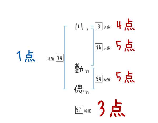 外運![]() | 川勤偲さんの外運は14画の1つ星!人に対して優しいがストレスを溜め込みがち。人間関係のトラブルを避けるよう気をつけましょう。 生活面を象徴する運勢です。外部から受ける影響力を表し、結婚運、家庭運や職場、環境への順応性を表します。 |