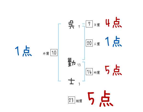 天運![]() | 呉勤士さんの天運は7画の4つ星!強い意志や信念を持ち独立心が強い。自立する。 家系が持つ宿命的な運勢を表します。祖先から受け継いだ苗字ですので自分の力が及びません。家柄を象徴します。 |