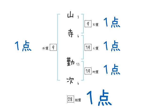 天運![]() | 山寺勤次さんの天運は9画の1つ星!消極的で才能を発揮することが苦手なことも。周りの意見に耳を傾けましょう。 家系が持つ宿命的な運勢を表します。祖先から受け継いだ苗字ですので自分の力が及びません。家柄を象徴します。 |
