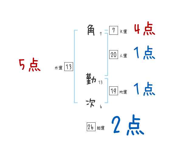 天運![]() | 角勤次さんの天運は7画の4つ星!強い意志や信念を持ち独立心が強い。自立する。 家系が持つ宿命的な運勢を表します。祖先から受け継いだ苗字ですので自分の力が及びません。家柄を象徴します。 |