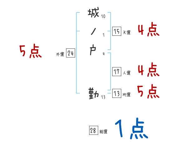 外運![]() | 城ノ戸勤さんの外運は24画の5つ星!家庭運が良く順調な人生。金運にも恵まれる。 生活面を象徴する運勢です。外部から受ける影響力を表し、結婚運、家庭運や職場、環境への順応性を表します。 |