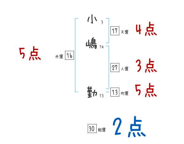 外運![]() | 小嶋勤さんの外運は16画の5つ星!人望が厚く大きく発展する。逆転成功が見える。 生活面を象徴する運勢です。外部から受ける影響力を表し、結婚運、家庭運や職場、環境への順応性を表します。 |