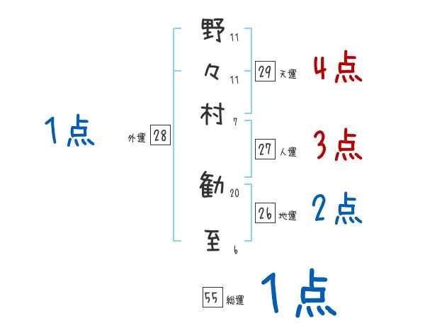 天運![]() | 野々村勧至さんの天運は29画の4つ星!完全主義で才能がある。厳格な心の持ち主。 家系が持つ宿命的な運勢を表します。祖先から受け継いだ苗字ですので自分の力が及びません。家柄を象徴します。 |
