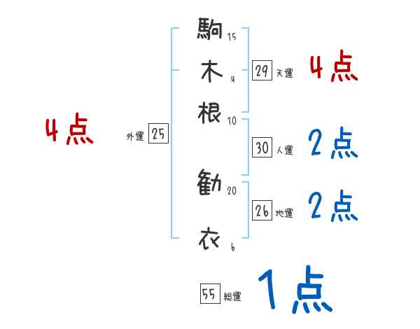 天運![]() | 駒木根勧衣さんの天運は29画の4つ星!完全主義で才能がある。厳格な心の持ち主。 家系が持つ宿命的な運勢を表します。祖先から受け継いだ苗字ですので自分の力が及びません。家柄を象徴します。 |