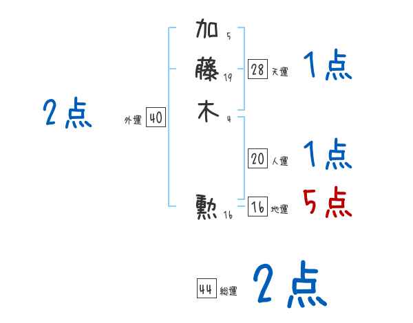 天運![]() | 加藤木勲さんの天運は28画の1つ星!家庭環境に注意。スポーツで活躍できる能力があるかも。 家系が持つ宿命的な運勢を表します。祖先から受け継いだ苗字ですので自分の力が及びません。家柄を象徴します。 |