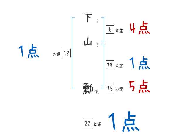 総運![]() | 下山勳さんの総運は22画の1つ星!努力することが苦手ないっぽう手先が器用。芸術性にも優れる。 あなたの人生を表す1番重要な運勢です。生涯を通じて影響する総合運となり、主に50歳以降の晩年期に影響を及ぼします。 |