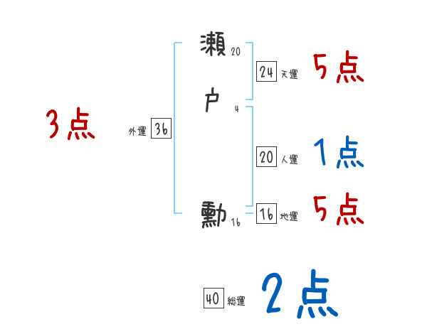天運![]() | 瀬戸勳さんの天運は24画の5つ星!家庭運が良く順調な人生。金運にも恵まれる。 家系が持つ宿命的な運勢を表します。祖先から受け継いだ苗字ですので自分の力が及びません。家柄を象徴します。 |