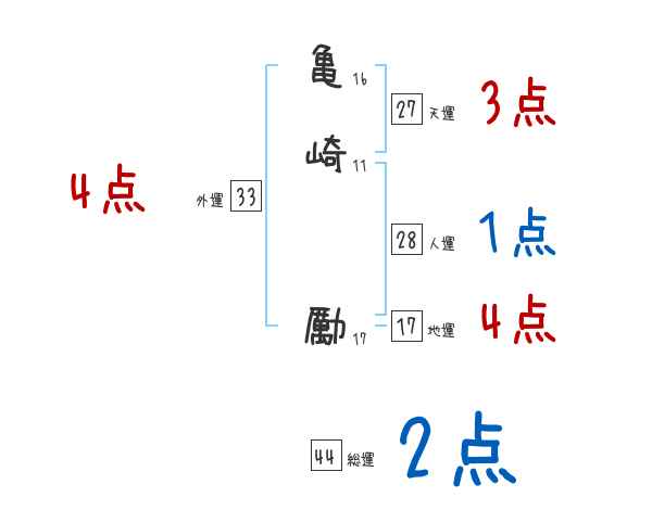 総運![]() | 亀崎勵さんの総運は44画の2つ星!誠実で慎重な性格。物事を考えすぎないように注意しましょう。 あなたの人生を表す1番重要な運勢です。生涯を通じて影響する総合運となり、主に50歳以降の晩年期に影響を及ぼします。 |