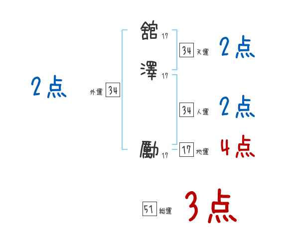 外運![]() | 舘澤勵さんの外運は34画の2つ星!独創性に優れるが、自尊心が強く災難に注意しましょう。 生活面を象徴する運勢です。外部から受ける影響力を表し、結婚運、家庭運や職場、環境への順応性を表します。 |