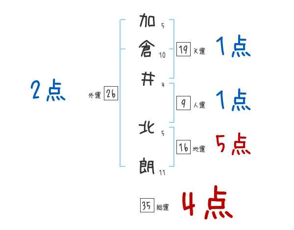 地運![]() | 加倉井北朗さんの地運は16画の5つ星!人望が厚く大きく発展する。逆転成功が見える。 個性を表す基礎的な運勢です。性格形成や対人関係、行動力など家庭環境に影響されます。主に誕生してから20歳くらいまでの若年期の運勢を表します。 |