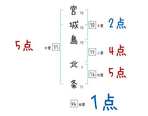 天運![]() | 宮城島北条さんの天運は30画の2つ星!浮き沈みの激しさに注意しましょう。 家系が持つ宿命的な運勢を表します。祖先から受け継いだ苗字ですので自分の力が及びません。家柄を象徴します。 |