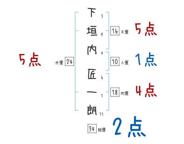 総運![]() | 下垣内匠一朗さんの総運は34画の2つ星!独創性に優れるが、自尊心が強く災難に注意しましょう。 あなたの人生を表す1番重要な運勢です。生涯を通じて影響する総合運となり、主に50歳以降の晩年期に影響を及ぼします。 |