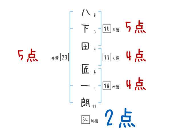 天運![]() | 八下田匠一朗さんの天運は16画の5つ星!人望が厚く大きく発展する。逆転成功が見える。 家系が持つ宿命的な運勢を表します。祖先から受け継いだ苗字ですので自分の力が及びません。家柄を象徴します。 |