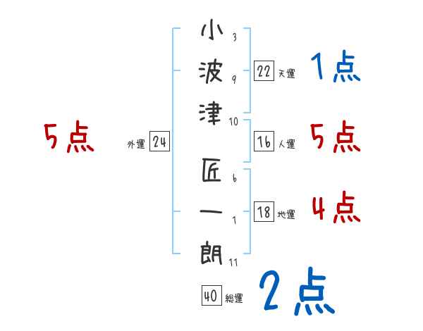 天運![]() | 小波津匠一朗さんの天運は22画の1つ星!努力することが苦手ないっぽう手先が器用。芸術性にも優れる。 家系が持つ宿命的な運勢を表します。祖先から受け継いだ苗字ですので自分の力が及びません。家柄を象徴します。 |