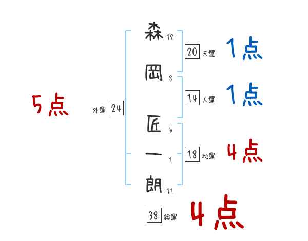 外運![]() | 森岡匠一朗さんの外運は24画の5つ星!家庭運が良く順調な人生。金運にも恵まれる。 生活面を象徴する運勢です。外部から受ける影響力を表し、結婚運、家庭運や職場、環境への順応性を表します。 |