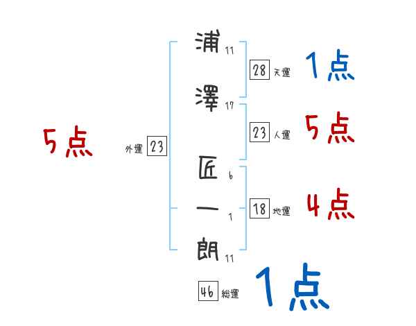 天運![]() | 浦澤匠一朗さんの天運は28画の1つ星!家庭環境に注意。スポーツで活躍できる能力があるかも。 家系が持つ宿命的な運勢を表します。祖先から受け継いだ苗字ですので自分の力が及びません。家柄を象徴します。 |