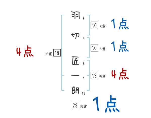 外運![]() | 羽切匠一朗さんの外運は18画の4つ星!情熱的で剛気。忍耐力があり信頼される。 生活面を象徴する運勢です。外部から受ける影響力を表し、結婚運、家庭運や職場、環境への順応性を表します。 |
