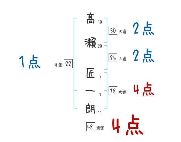 総運![]() | 髙瀨匠一朗さんの総運は48画の4つ星!賢明な性格で人望が厚い。指導力があり多くの人に尊敬される。 あなたの人生を表す1番重要な運勢です。生涯を通じて影響する総合運となり、主に50歳以降の晩年期に影響を及ぼします。 |