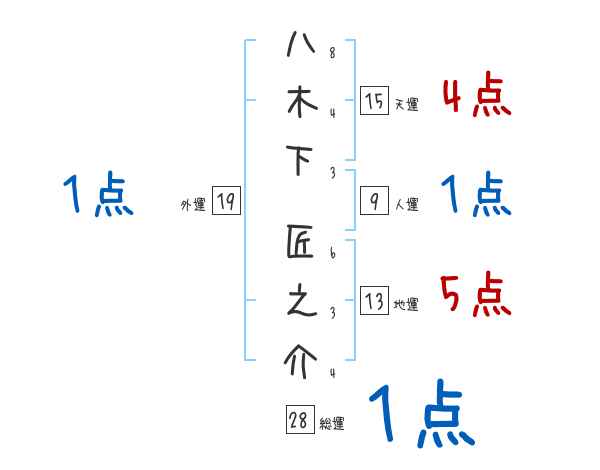 天運![]() | 八木下匠之介さんの天運は15画の4つ星!人徳があり出世する。順調に物事を進め円満な人生。 家系が持つ宿命的な運勢を表します。祖先から受け継いだ苗字ですので自分の力が及びません。家柄を象徴します。 |