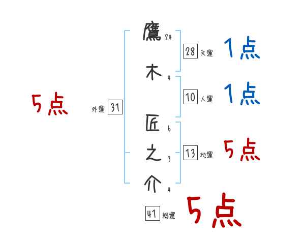 天運![]() | 鷹木匠之介さんの天運は28画の1つ星!家庭環境に注意。スポーツで活躍できる能力があるかも。 家系が持つ宿命的な運勢を表します。祖先から受け継いだ苗字ですので自分の力が及びません。家柄を象徴します。 |