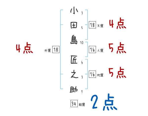 人運![]() | 小田島匠之助さんの人運は16画の5つ星!人望が厚く大きく発展する。逆転成功が見える。 性格や才能などを表す2番目に重要な運勢です。人間関係や協調性、社会的な成功に影響します。主に20歳から50歳ぐらいまでの中年期の運勢を表します。 |