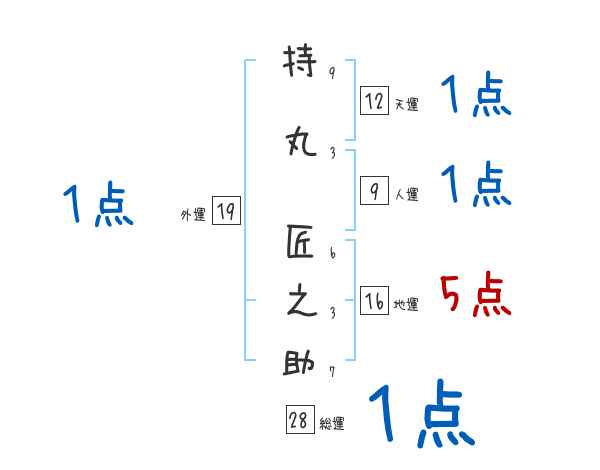 地運![]() | 持丸匠之助さんの地運は16画の5つ星!人望が厚く大きく発展する。逆転成功が見える。 個性を表す基礎的な運勢です。性格形成や対人関係、行動力など家庭環境に影響されます。主に誕生してから20歳くらいまでの若年期の運勢を表します。 |