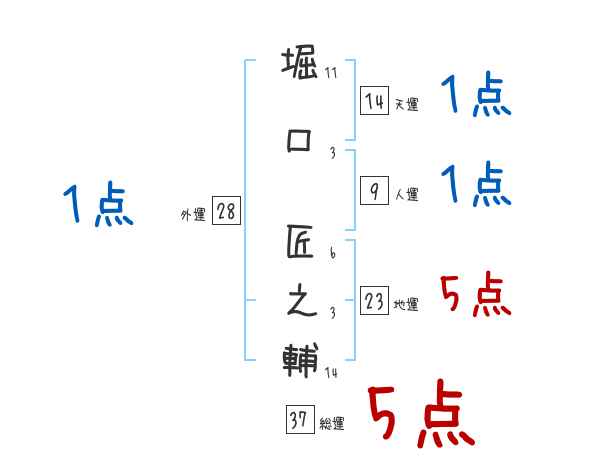 天運![]() | 堀口匠之輔さんの天運は14画の1つ星!人に対して優しいがストレスを溜め込みがち。人間関係のトラブルを避けるよう気をつけましょう。 家系が持つ宿命的な運勢を表します。祖先から受け継いだ苗字ですので自分の力が及びません。家柄を象徴します。 |