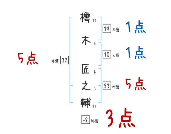 外運![]() | 樗木匠之輔さんの外運は32画の5つ星!柔軟性があり成功する。チャンスが多く金運が良い。 生活面を象徴する運勢です。外部から受ける影響力を表し、結婚運、家庭運や職場、環境への順応性を表します。 |